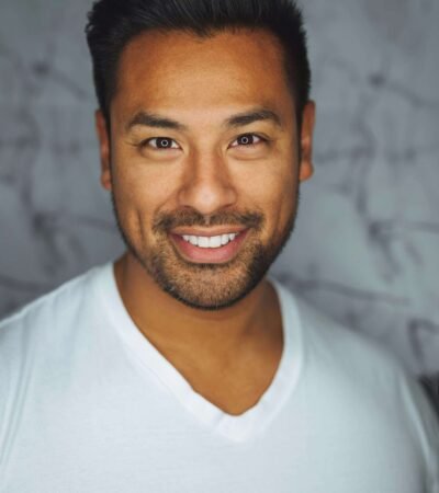 A person stands smiling and making a peace sign in front of a backdrop featuring movie posters and a film reel design. The background includes a green leafy wall and posters for different films in various shades.